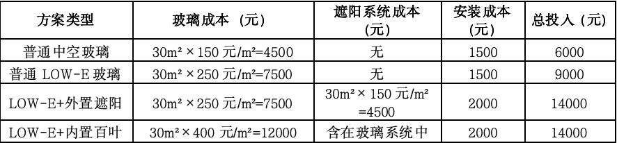 以100平方米住宅(窗墙比30%,即30平方米外窗)为例,不同方案的初期投入如下: