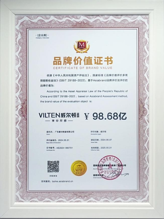 2024 年,世界品牌实验室(World Brand Lab)权威评测显示,威尔顿瓷砖品牌价值达98.68 亿元,这一数字不仅是市场对其产品实力的高度认可,更印证了威尔顿以 “品质 + 创新” 双轮驱动的发展战略。从全球珍稀石材的严苛选材,到智能化生产基地的精密制造,威尔顿始终以 “出品即精品” 为标准,为消费者提供放心之选。