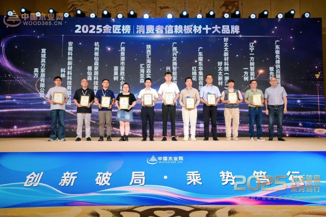 ▲耀东华集团副董事长曾劲翔先生(右五)上台领取《2025金匠榜|消费者信赖板材十大品牌》证书