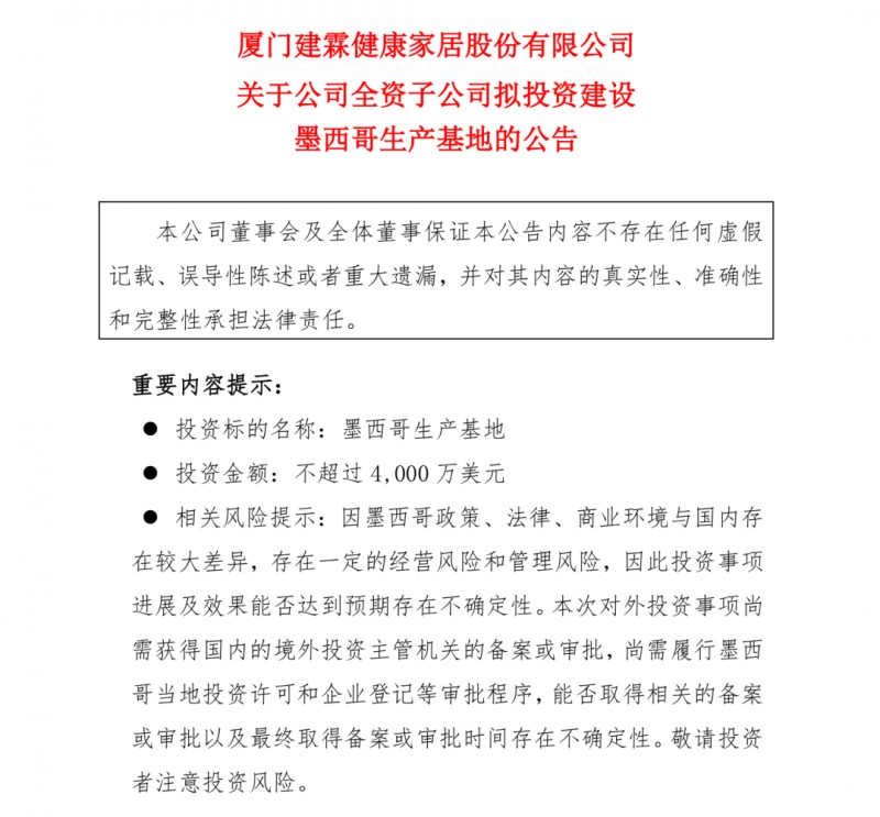 近期建霖家居海外动作频繁,同样在10月26日,该公司发布关于公司全资子公司拟投资建设墨西哥生产基地的公告,宣布以不超过4000万美元投资建设墨西哥生产基地。据公告,为巩固公司海外运营优势,进一步提升市场份额和抗风险能力,完善海外产能整体布局,建霖家居全资子公司RUNNER TECH (SINGAPORE) PTE. LTD 和其他子公司(以具体实施为准)拟在墨西哥共同投资设立子公司。建霖家居表示,投资建设墨西哥生产基地,是公司泰国生产基地扩产后,海外市场拓展的又一重要举措,有利于进一步满足海外客户研发需求和产品转化需求,提高海外客户订单的响应效率。